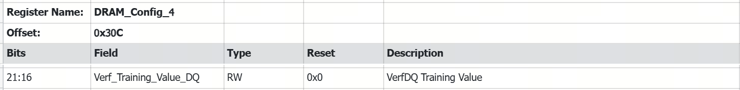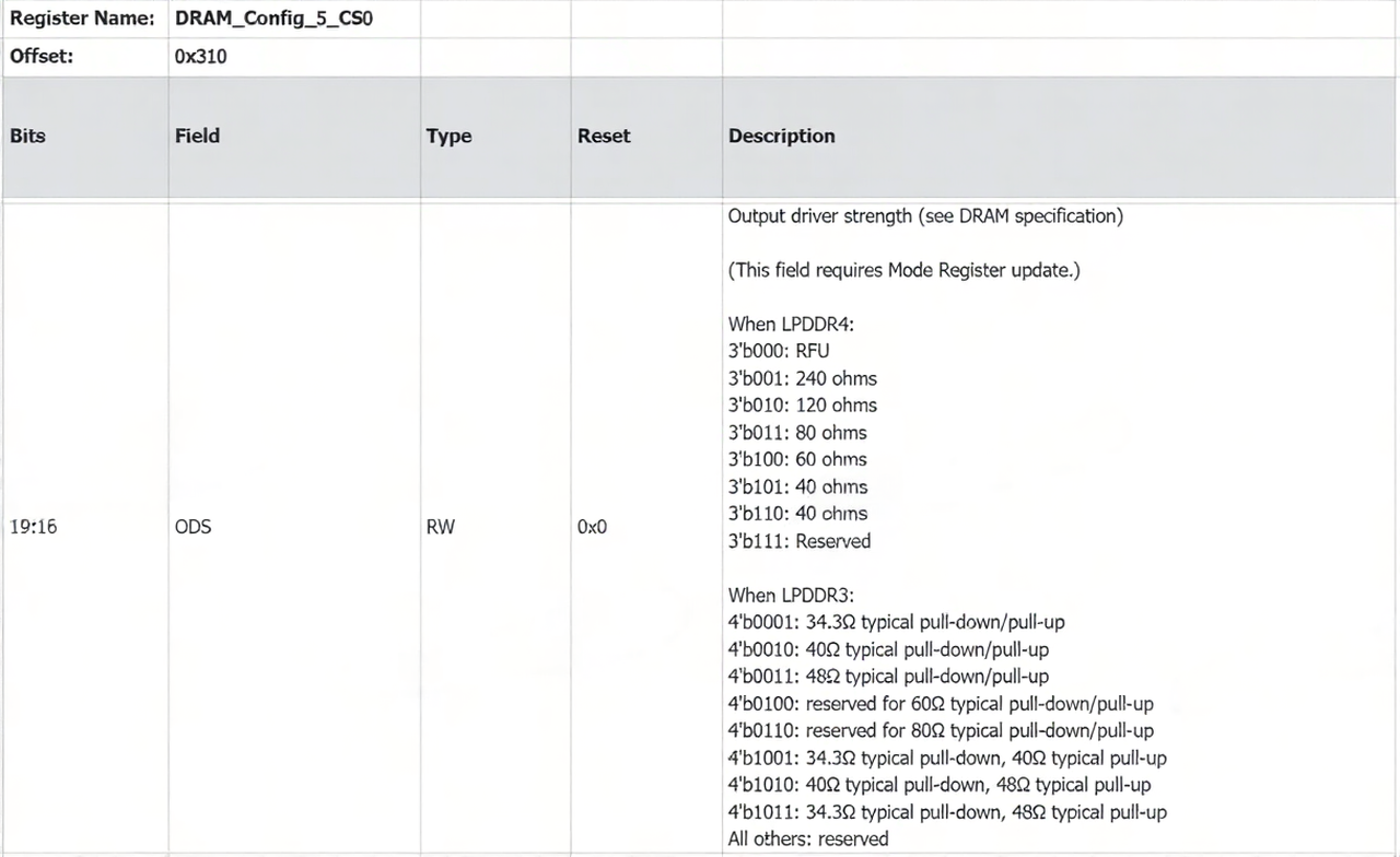 对应寄存器位描述如下图,两个 CS 对应两个寄存器:DRAM_Config_5_CS0(offset 0x310)、DRAM_Config_5_CS1(offset 0x314),每个频点都需要配置。